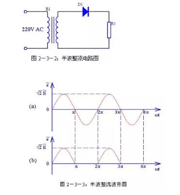 半波整流電路見(jiàn)圖2-3-2。其中B1是電源變壓器,D1是整流二極管,R1是負(fù)載。B1次級(jí)是一個(gè)方向和大小隨時(shí)間變化的正弦波電壓,波形如圖 2-3-3(a)所示。0~π期間是這個(gè)電壓的正半周,這時(shí)B1次級(jí)上端為正下端為負(fù),二極管D1正向?qū)ǎ娫措妷杭拥截?fù)載R1上,負(fù)載R1中有電流通過(guò);π~2π期間是這個(gè)電壓的負(fù)半周,這時(shí)B1次級(jí)上端為負(fù)下端為正,二極管D1反向截止,沒(méi)有電壓加到負(fù)載R1上,負(fù)載R1中沒(méi)有電流通過(guò)。在 2π~3π、3π~4π等后續(xù)周期中重復(fù)上述過(guò)程,這樣電源負(fù)半周的波形被“削”掉,得到一個(gè)單一方向的電壓,波形如圖2-3-3(b)所示。由于這樣得到的電壓波形大小還是隨時(shí)間變化,我們稱(chēng)其為脈動(dòng)直流。